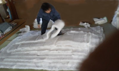 | 綿は引っ張って伸ばすとチジもうとするので、そっと敷きます。 繊維は一方向にならして製綿されますので、縦横に敷きます。 使用する綿の枚数が十分なので、 上下左右を折っても中の厚さは保たれています。 角を作るために切った綿は、 最後にふたをする前に、中央部の成型に使います。 お客様の綿は、すべて無駄にしません。 |